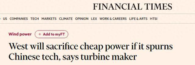 英国《金融时报》近日刊文说,中国在风电设备制造领域的成本优势已极为显著。与西方企业相比,成本优势至少在四成以上。欧美国家虽然在新能源领域加强本土化布局,但若不能与中国风电制造行业合作,其风电项目的整体造价将明显上升,最终导致电力成本攀升。